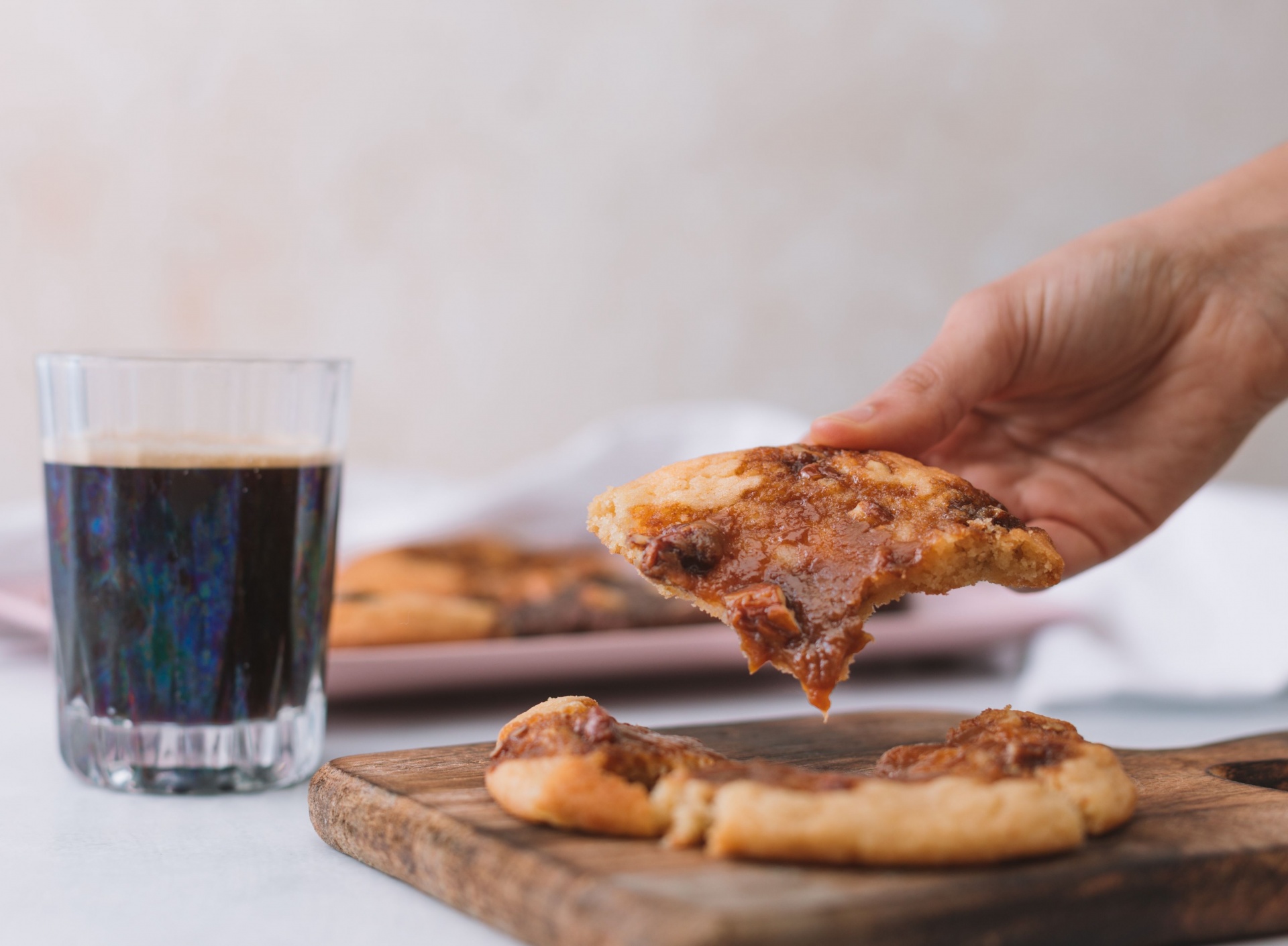 - 1 cookie com base de manteiga e recheio de nougat de noz pecan, doce de leite e speculoos