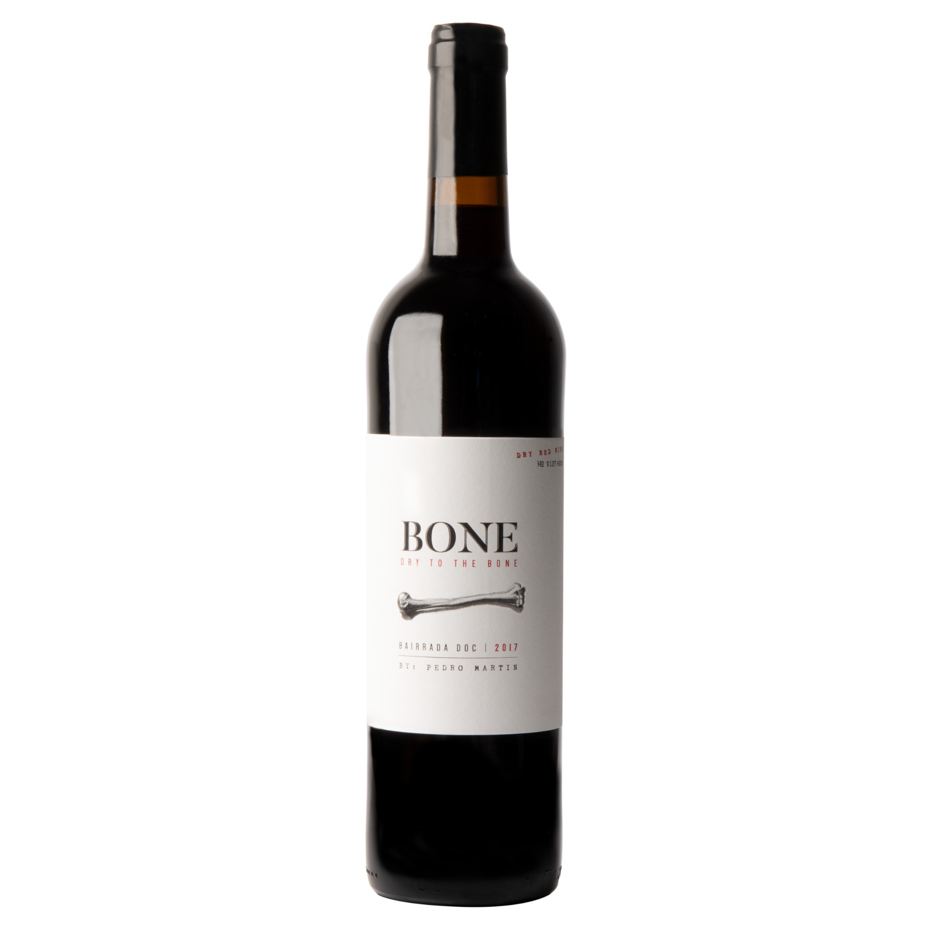 • Garrafa de vinho tinto com rótulo branco Bone Dry to the Bone Alfrocheiro DOC 2017.
