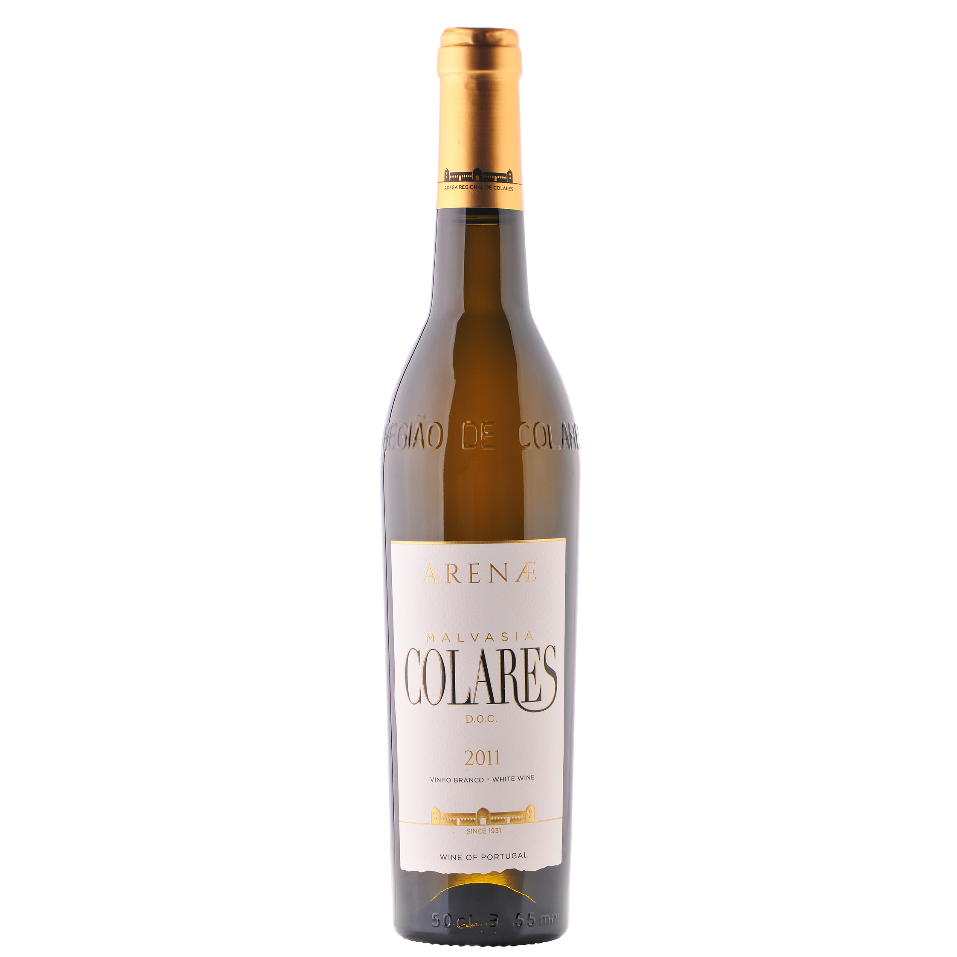 • Garrafa de vinho branco Malvasia Colares 2011 com rótulo branco e dourado