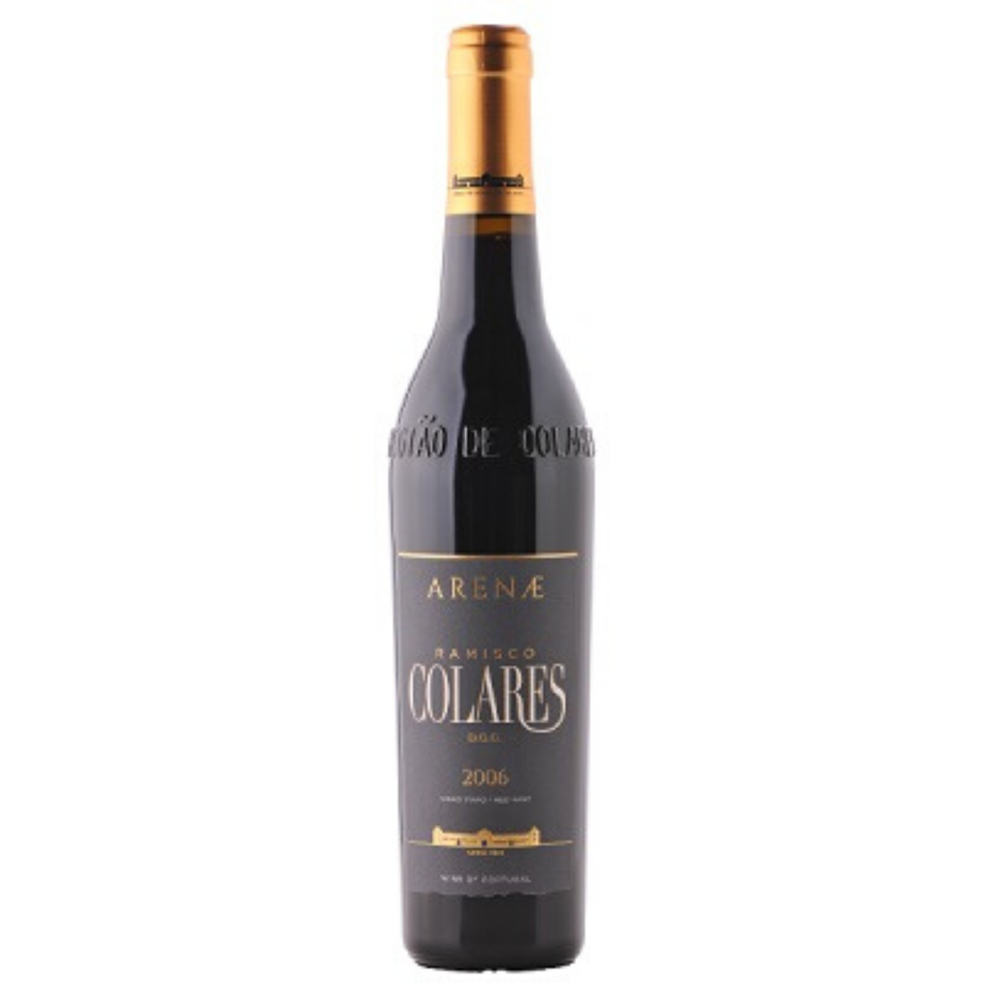 • Garrafa de vinho tinto ARENÆ RAMISCO COLARES 2006 com rótulo preto e dourado