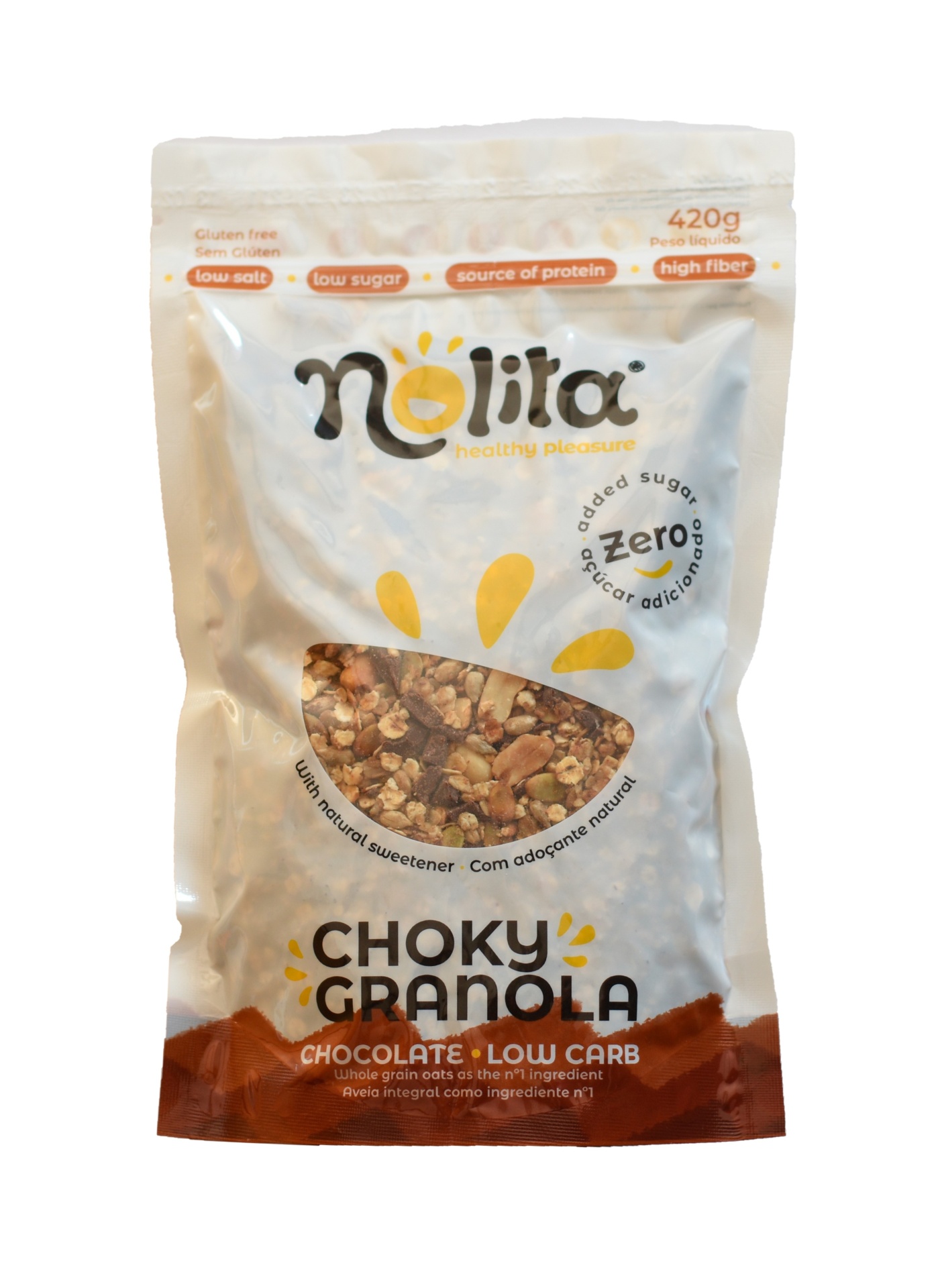 Granola Choky: Flocos de AVEIA integral* 24%, Sementes (Girassol, Abobora), Chocolate [Pasta de cacau, adoçante (maltitol), fibra (inulina) manteiga de cacau, emilsionante (lectina de SOJA) e aroma (baunilha)], AMENDOIM, Adoçante natural com zero caloriais (Erythritol) 8 %, Óleo de girassol alto oleico , Canela*