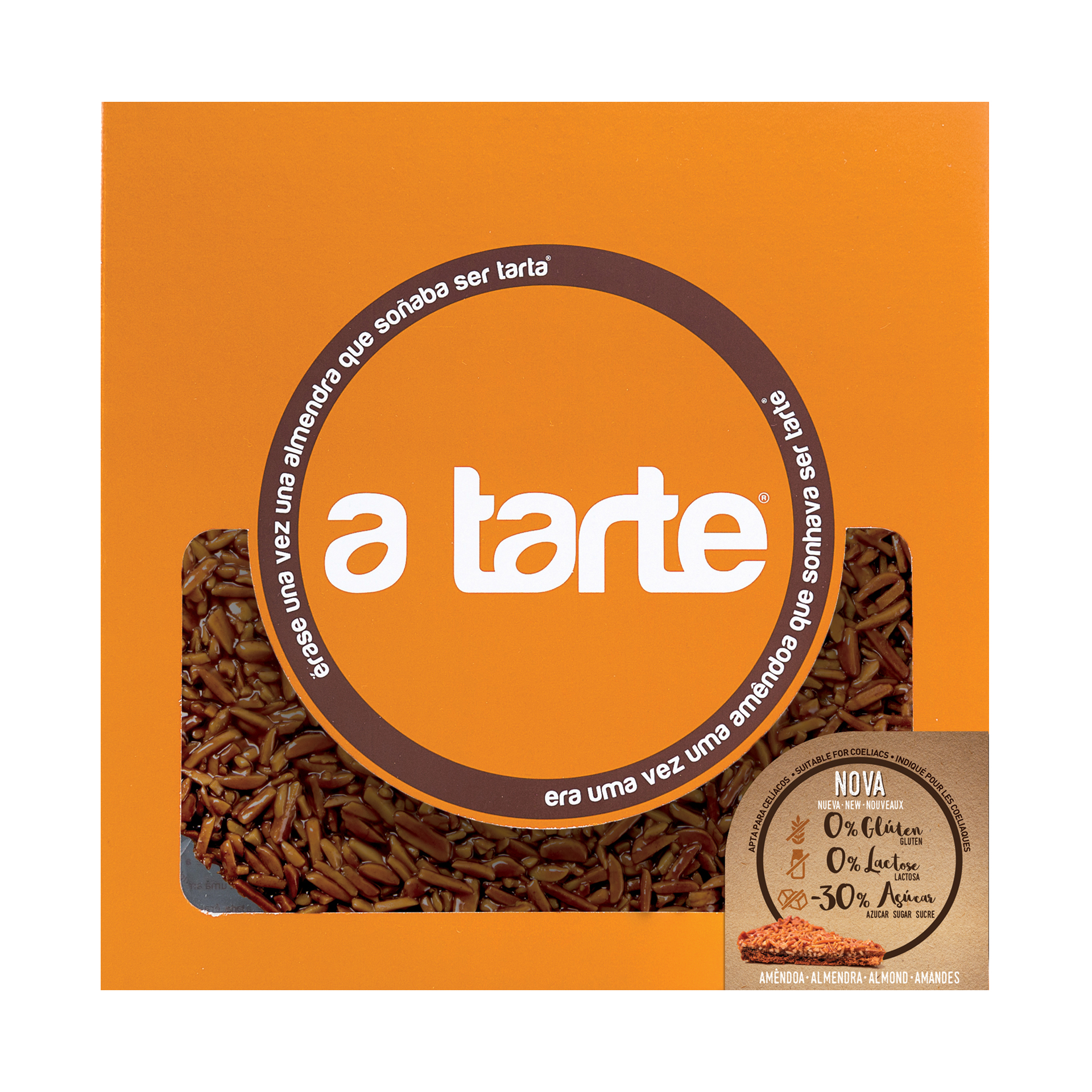 A versão da famosa tarte de amêndoa sem glúten, sem lactose e com menos 30% de açúcar. A mesma tentação, numa deliciosa base macia feita com farinha de arroz e produtos sem lactose, e com o genuíno caramelo crocante envolvido em amêndoas a que A Tarte nos habituou.