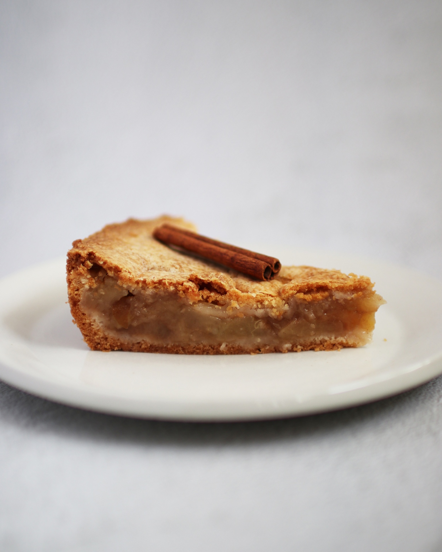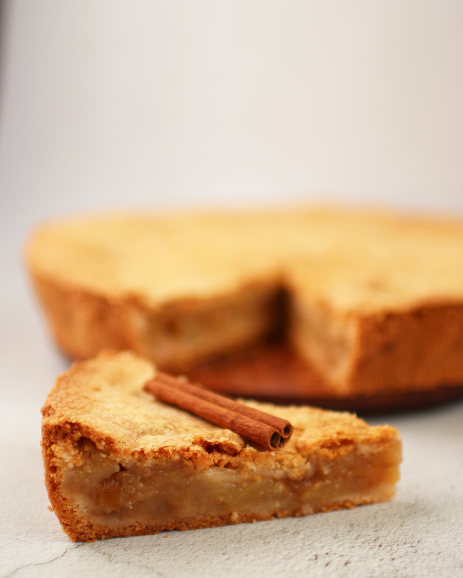 • Tarte redonda dourada com fatia cortada e pau de canela